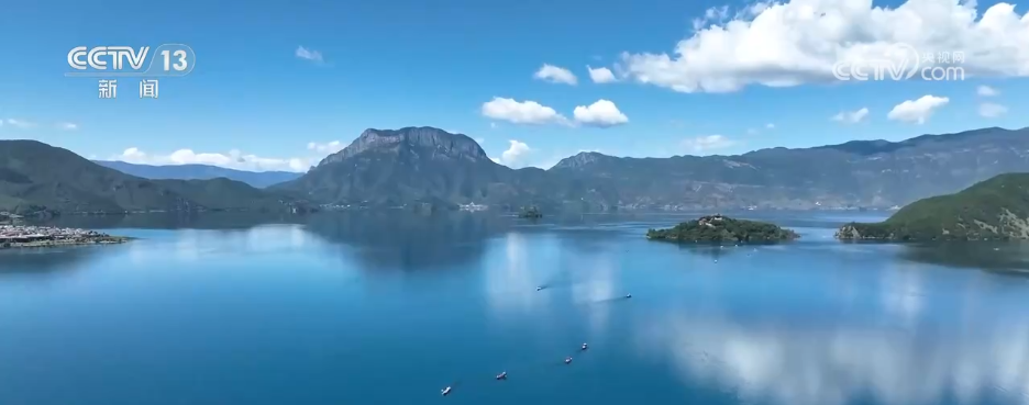 有的凭借非遗体验出圈,也有的主打美景资源,泸沽湖位于云南省宁蒗彝族自治县与四川省盐源县交界处,秋日的川滇交界,从空中俯瞰,泸沽湖犹如一块巨大的蓝宝石镶嵌于群山之中,倒映着山峦的俊秀与云影的轻盈,船儿轻划水面,勾勒出人与自然和谐共生的诗意画卷。泸沽湖湖面海拔2691米,是中国第三深的淡水湖,被誉为“高原明珠”。近年来,当地坚持做好水资源保护等工作,守护好这一抹抚慰人心的宁静蓝,泸沽湖稳定保持国家I类水质。国庆中秋假期,丽江泸沽湖景区接待游客4.75万人次,同比增长42.93%。